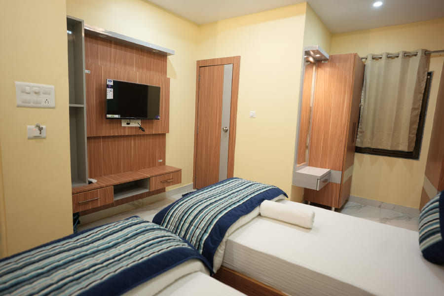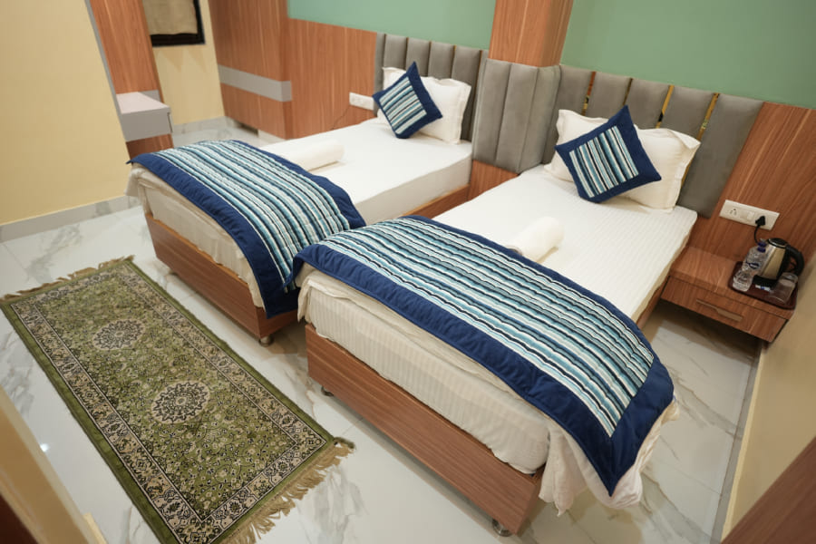 The Deluxe Twin Bed Room at Heaven Heritage Varanasi is thoughtfully designed for comfort, versatility, and a rich cultural ambiance, making it an ideal choice for friends, siblings, or travelers seeking separate sleeping arrangements without compromising on luxury. The room features two beautifully crafted single beds adorned with soft, high-quality linens and traditional Banarasi textiles that reflect the city’s artistic legacy. Earthy tones, heritage-style furniture, and locally inspired decor—such as handwoven rugs, vintage photographs, and subtle brass accents—create a warm, authentic setting that immerses guests in the spirit of Varanasi. Modern conveniences such as air conditioning, high-speed Wi-Fi, a flat-screen TV, a writing desk, and a private ensuite bathroom with eco-friendly toiletries are all provided to ensure a relaxed and pleasant stay. Generous windows let in natural light and offer charming views of the property’s inner courtyard or the bustling streets beyond. Whether you're returning from a sunrise boat ride on the Ganges or winding down after a cultural walk through the old city, the Deluxe Twin Bed Room offers a peaceful sanctuary where heritage meets hospitality in every thoughtful detail.