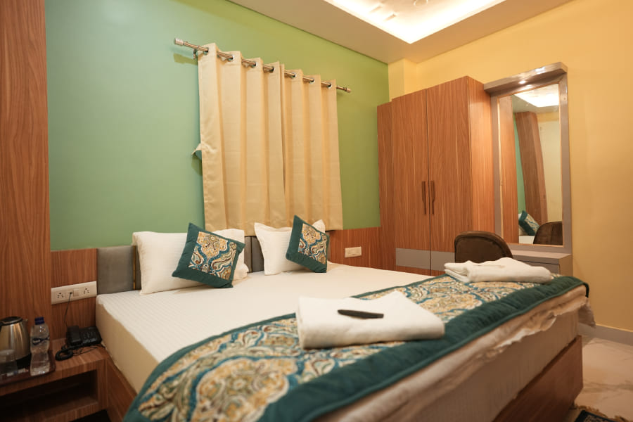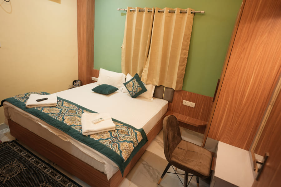 The Executive Double Bed Room at Heaven Heritage Varanasi is a premium sanctuary designed for guests who appreciate elevated comfort wrapped in cultural elegance. Featuring a luxuriously spacious layout, the room includes a plush double bed with high-thread-count linens, rich wooden furnishings, and carefully curated décor inspired by Varanasi’s timeless heritage. From intricately patterned silk drapes to handpicked antiques and soft, ambient lighting, every element in the room reflects a sense of refined tradition and warmth. Perfect for couples, business travelers, or anyone seeking an indulgent stay, the room also offers modern conveniences such as air conditioning, high-speed Wi-Fi, a smart TV, a writing desk, a tea/coffee station, and a private ensuite bathroom with premium toiletries. Thoughtfully placed windows or a private balcony provide peaceful views of the heritage courtyard or cityscape, allowing guests to enjoy quiet mornings with a cup of chai or unwind in the golden glow of the evening. The Executive Double Bed Room seamlessly blends contemporary luxury with the soul of Varanasi, making it a perfect haven for those who want a richer, more immersive experience of this sacred city.